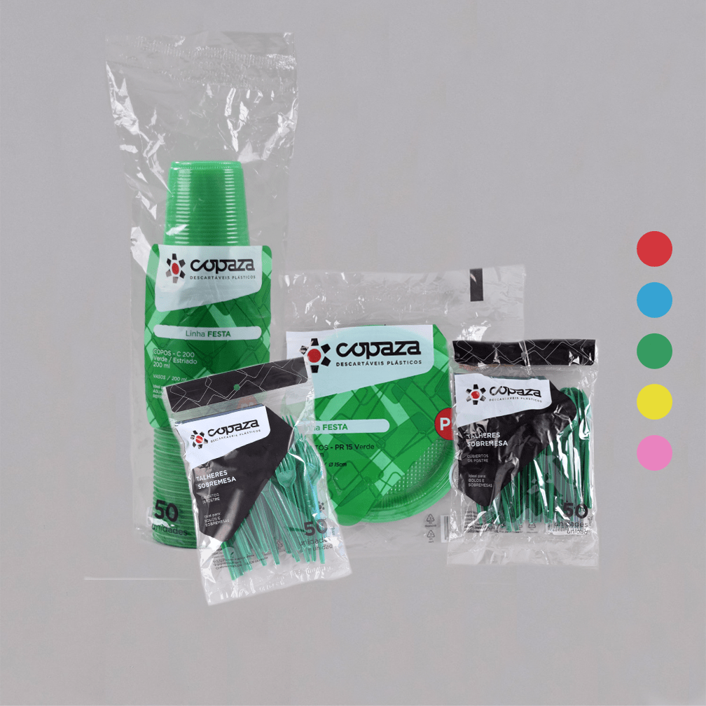 1 pacote do Copo Verde 200 ml - C/50 Unidades 5 Pacotes do Prato Verde 15 cm - C/10 Unidades 1 pacote do Colher Sobremesa Verde 12,00 cm - C/50 Unidades 1 Pacote do Garfo Sobremesa Verde 12,00 cm - C/50 Unidades