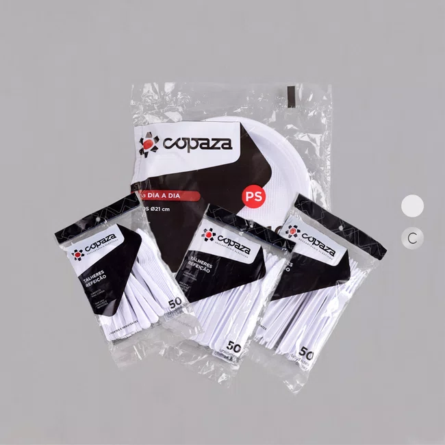 5 Pacotes de Prato Branco 21 cm - C/10 Unidades 1 Pacote de Garfo Refeição Branco 17,70 cm - C/50 Unidades 1 pacote de Colher Refeição Branco 15,50 cm - C/50 Unidades 1 pacote de Faca Refeição Branco 18,50 cm - C/50 Unidades