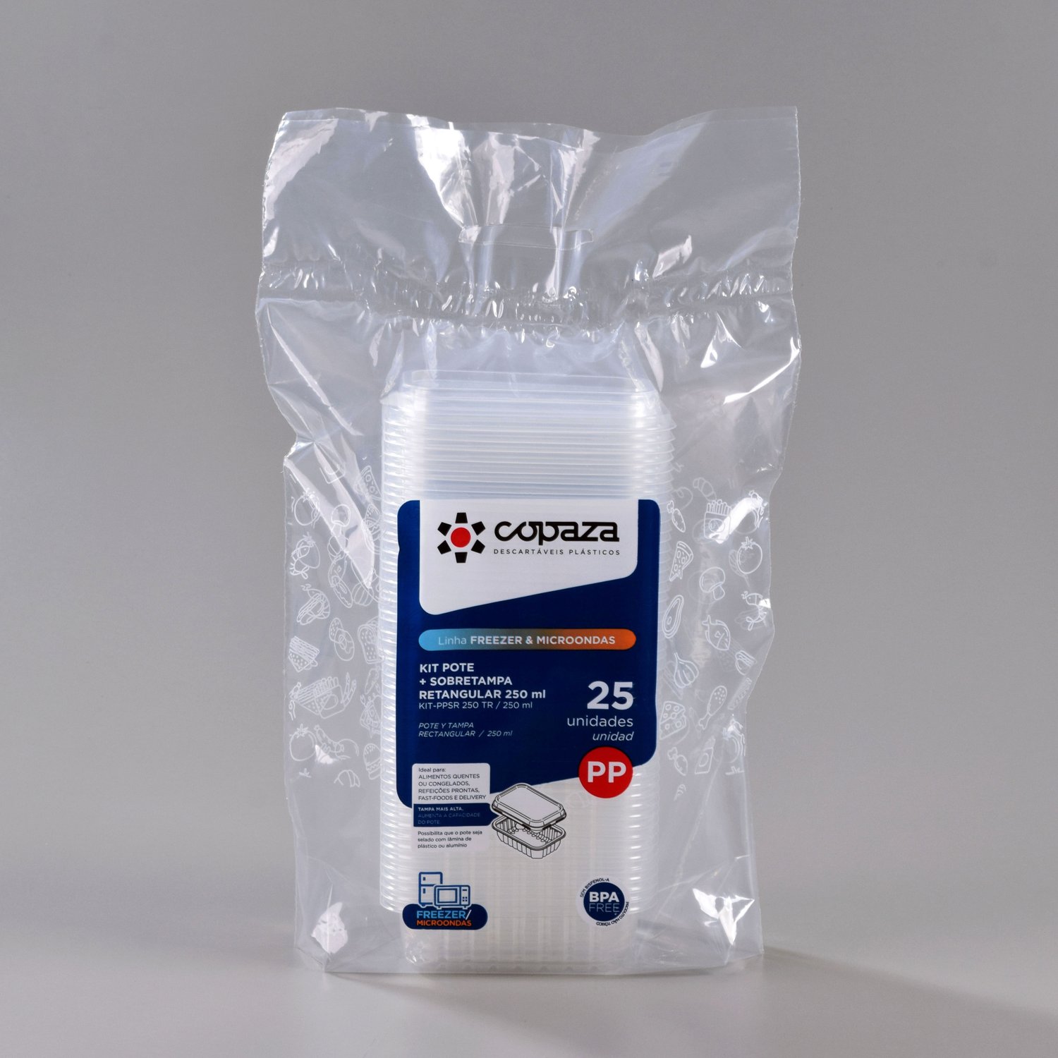O pote retangular com sobretampa de 250 ml é ideal para armazenar e servir alimentos como refeições prontas, pratos quentes, porções individuais e itens congelados de forma prática e segura. Seu design compacto e funcional facilita o transporte e a organização, sendo perfeito para lanchonetes, restaurantes, fast food e serviços de delivery. Fabricado em polipropileno atóxico, o pote é resistente, durável, livre de BPA e 100% reciclável, além de ser apto para micro-ondas e freezer, garantindo versatilidade no uso diário.